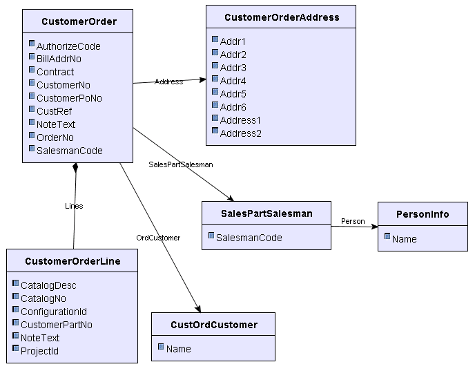 CustomerOrder is the master LU and it has an array of CustomerOrderLines and references to CustOrdCustomer, SalesPartSalesMan and CustomerOrderAddress. SalesPartSalesman has a reference to PersonInfo.