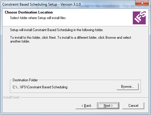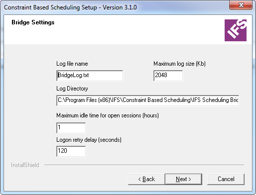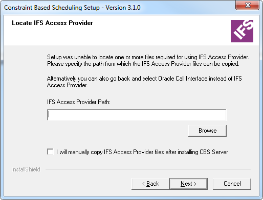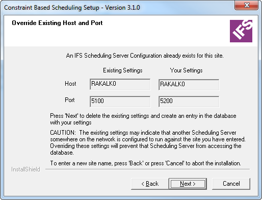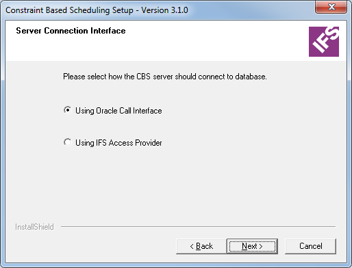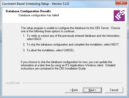 To recover from problems encountered during the installation process, uninstall the Bridge and/or Server (Uninstalling IFS Constraint Based Scheduling), correct the underlying problem with the CBS Server machine or database, and run the installation program again.