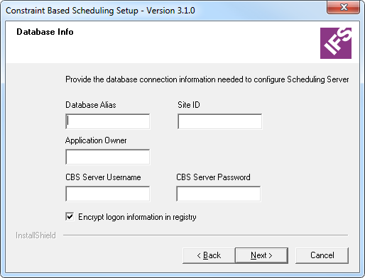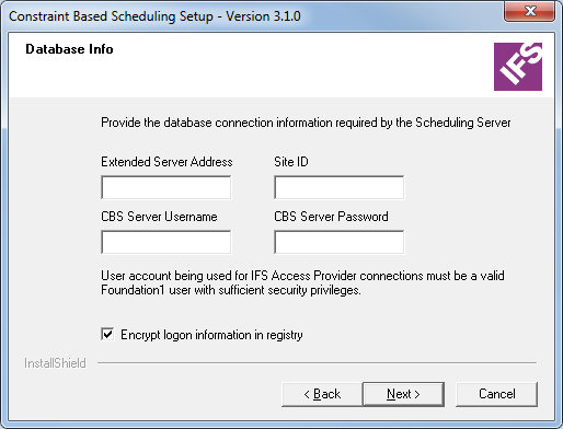 Site ID (Existing) for CBS Server to Connect To | Enter the name of the site against which you will be running the Scheduling Server. This site must exist before you install the server. This field is not shown in this wizard window if you have chosen not to install the server. |