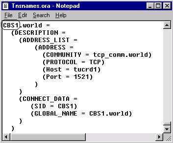 Note: Remember that this name is case sensitive when you enter it in the SQL*Net Alias for Database field in the CBS Database Settings dialog box during the CBS server installation. Make this name UPPERCASE in tnsnames.ora, since the CBS installer converts the database alias that you enter during installation to uppercase.