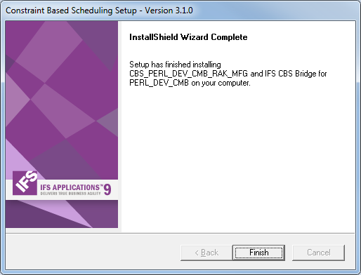 When the IFS Applications build (using the IFS Configuration Builder) was performed, several CBS files were copied to the client/runtime directory of the build. These files include schedserv.exe, Ifs.Cbs.AccessProviderWrapperBridge.dll, Ifs.Cbs.AccessProviderWrappers.dll, Ifs.Cbs.GraphWrapperBridge.dll, Ifs.Cbs.GraphWrappers.dll, msvcp100.dll, msvcr100.dll, xmllite.dll, ZedGraph.dll, default.xml and all of the language translation files Cbsxx.xml, where “xx” is the language code.