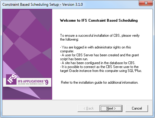 Certain systems and configurations must exist on your system before you install IFS Constraint Based Scheduling. The CBS setup program does not install or configure an IFS Applications database or the Oracle setup procedure necessary to connect to a specific database.