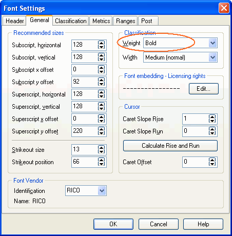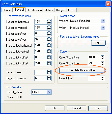 Select the General tab and set Caret Slope values by clicking the Calculate Rise and Run button.