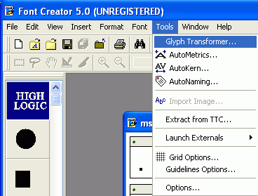 Now, to start the Transformer Wizard select the menu option Glyph Transformer from the Tools menu.
