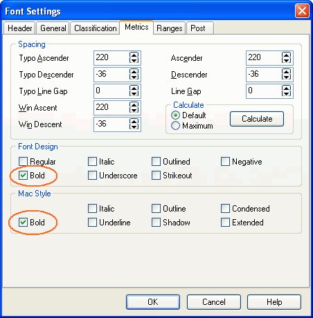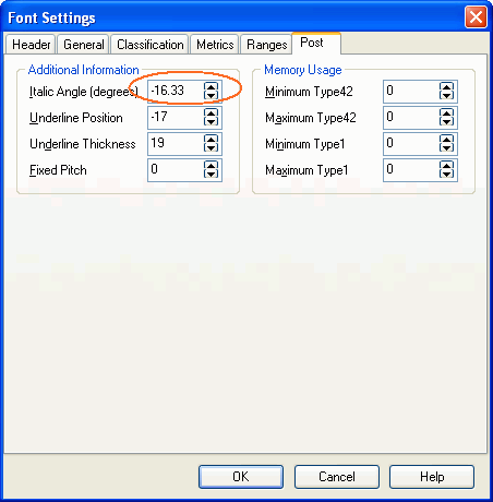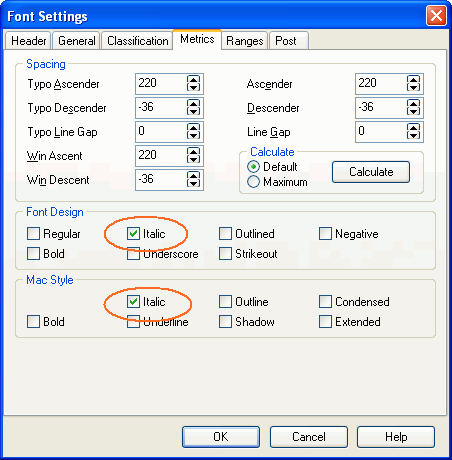 Now you have completed the task of transforming all glyphs from Regular to Italic. Next step is to change the font type defined in the ttf from Regular to Italic. To set the correct font type change the following settings.