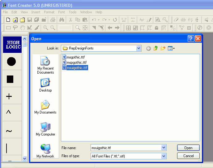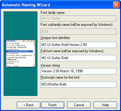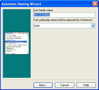 When transforming a font from a Regular to Bold one needs to perform two tasks. First, we must transform the glyphs of the regular font to bold. Secondly, we must change the font type of the true type file to bold. The following steps describe the steps to create a MS UI Gothic Bold from a given MS UI Gothic Regular font.