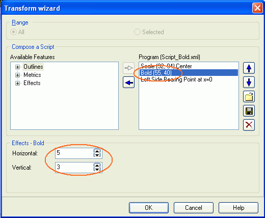 Back in the Transform Wizard dialog, set the Bold settings Horizontal and Vertical to the custom values as depicted below.