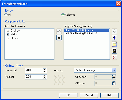 Apply the italic transformation: Start the Transformer Wizard by selecting the menu option Glyph Transformer from the Tools menu.