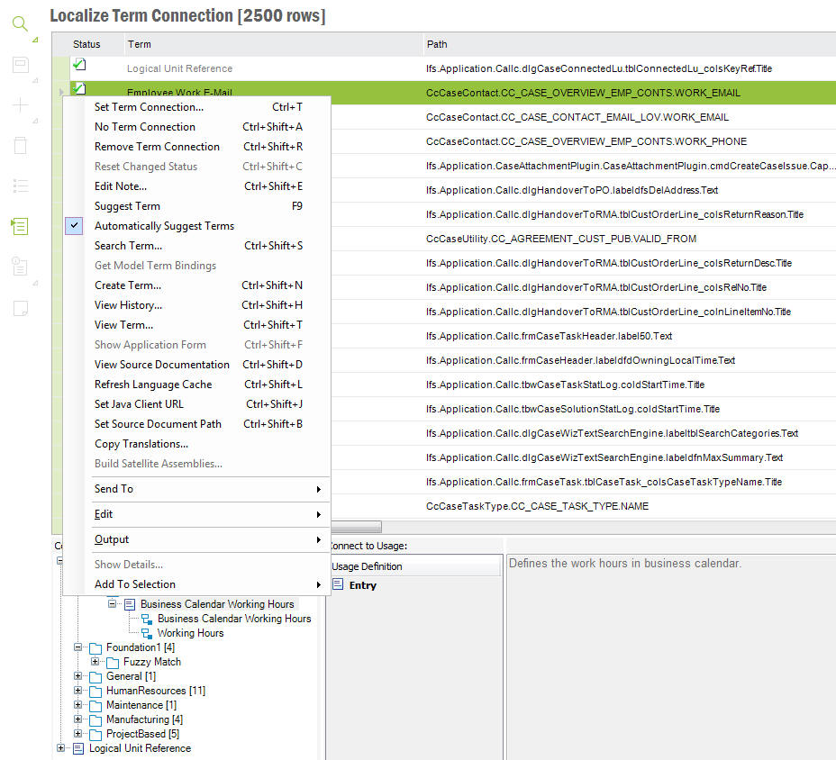 The unique identifier to the application label that can be connected to a term is displayed in the Context Path column. The actual source label is visible in the Prog. Text column. The suggest term functionality that can be toggled on and off at the menu option Automatically Suggest Term uses the prog text in order to find matching terms. You can also right click on a selected record and use menu option Suggest Term.