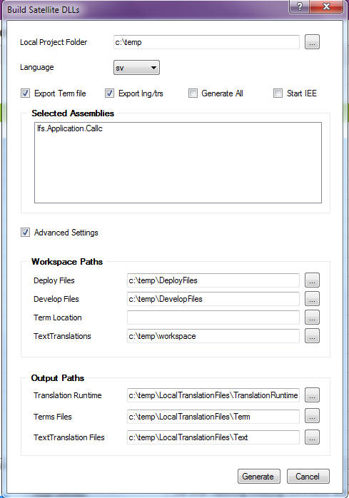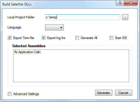 Once user defines those parameters, user can generate the satellite assemblies for selected DLLs. Advanced Settings option allow users to amend optional parameters according to user requirements.