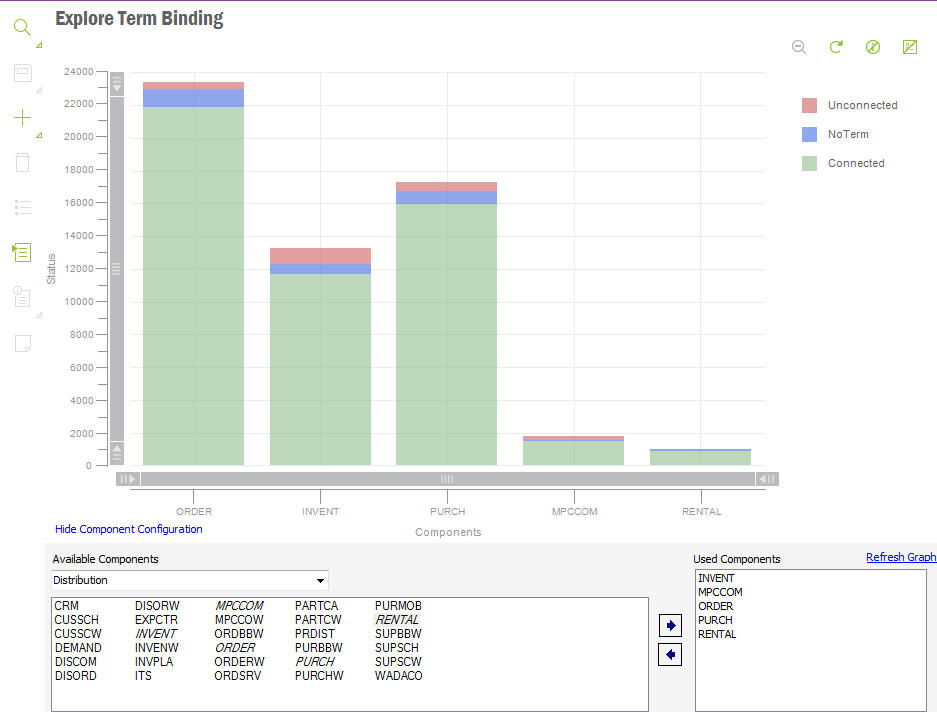 Here you can configure which components you want to be displayed in the chart. Click the Show Component Configuration link to view the configuration. Select available components and press the arrow button to include it, or use drag and drop. Used components are stored in your profile. You can navigate to the Term Binding feature by clicking in the graph. This chart can be used as your personal start page for term binding.