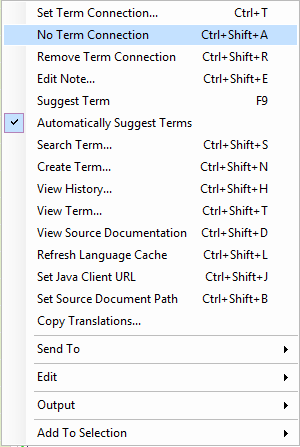 Figure 8. The complete list of menu items for the Term Binding feature. In this figure the record is marked as a No Term Connection.