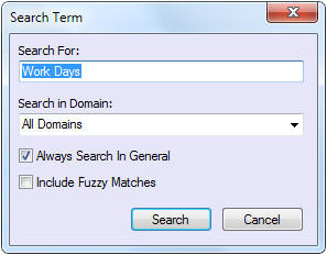 To search for a term select the record, right click and select menu option Search Term. This opens up the Search Term dialog where you can specify your own search criteria, see figure 4. It's also possible to limit your search to a certain domain. If the Always Search In General check box is selected so will the system search for matching terms both in the specified domain and in the General domain.