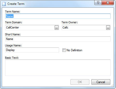 The source label is defaulted as term name (full name) and short name. The system also tries to find domain and owner from the current term owner component connection. All defaulted values can of course be changed. If the OK button is not enabled, make sure that the Term Domain and Term Owner values gets validated correctly.