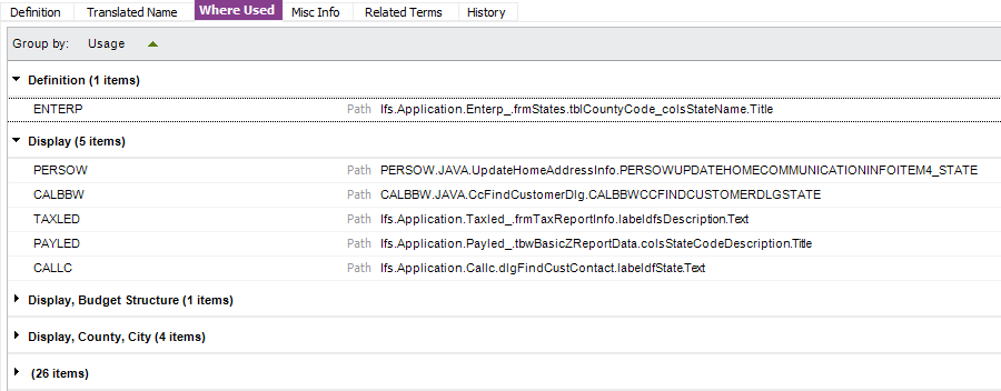 Open the detailed feature (Manage Term) for a specific term and click on the Where Used tab. This gives you an overview of where the term is used. It's also possible to group on display type and usage definition to easily see which application labels they are connected to, see figure 10.