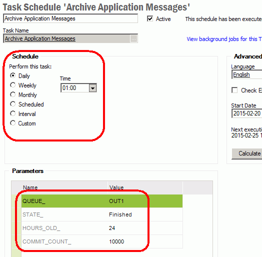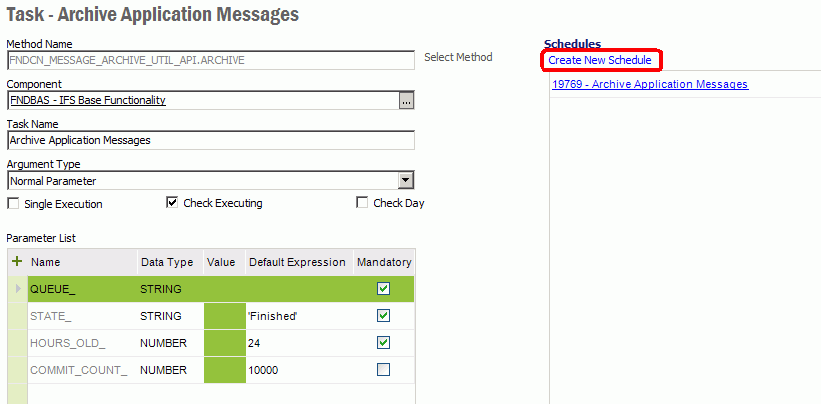 The installation creates a Database Task with name Archive Application Messages that can be found in the Database Tasks window located in IFS Solution Manager > Background Processing Database Tasks.