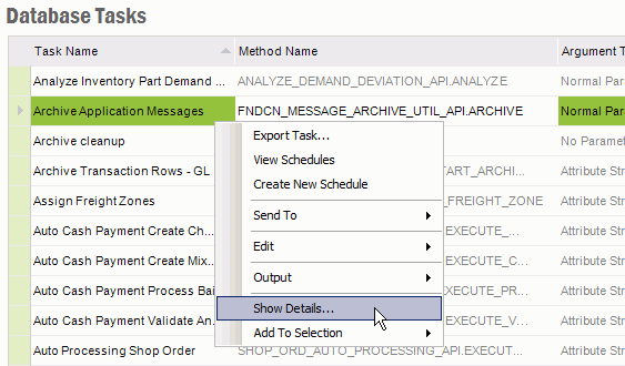 Locate the Archive Application Message task and choose Show Details from the context menu.