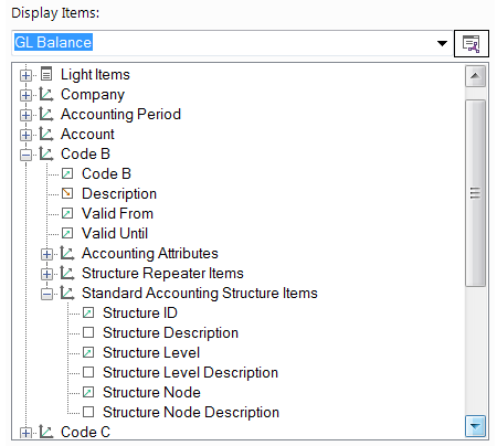 Since the code part value is a leaf in an accounting structure, this means that the leaf value can appear many times in a company but actually only once per structure. The first thing that must be taken care of is to flatten out the structure information so that all leaves are moved up in the structure. The goal is to make sure that each level shows all leaves that affects it.