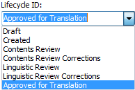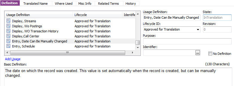 All new usage definitions is created in the first lifecycle stage that is defined in Manage Term Basic Data. The first lifecycle stage is Draft if the pre-defined basic data is used. Lifecycles are used when the usage is in a Preliminary state to follow up authoring progress before it can be released for translation. The predefined lifecycle data contains stages as Draft, Content Review, Linguistic Review and Approved for Translations.