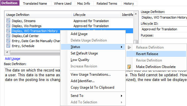 The release can be undone (reverted) if the usage definition is released by mistake. Right click on the Definition tab in the Manage Term feature for a selected usage and select the Revert Release menu item, see figure 3 below. This will set back the selected usage definition to a Preliminary state.